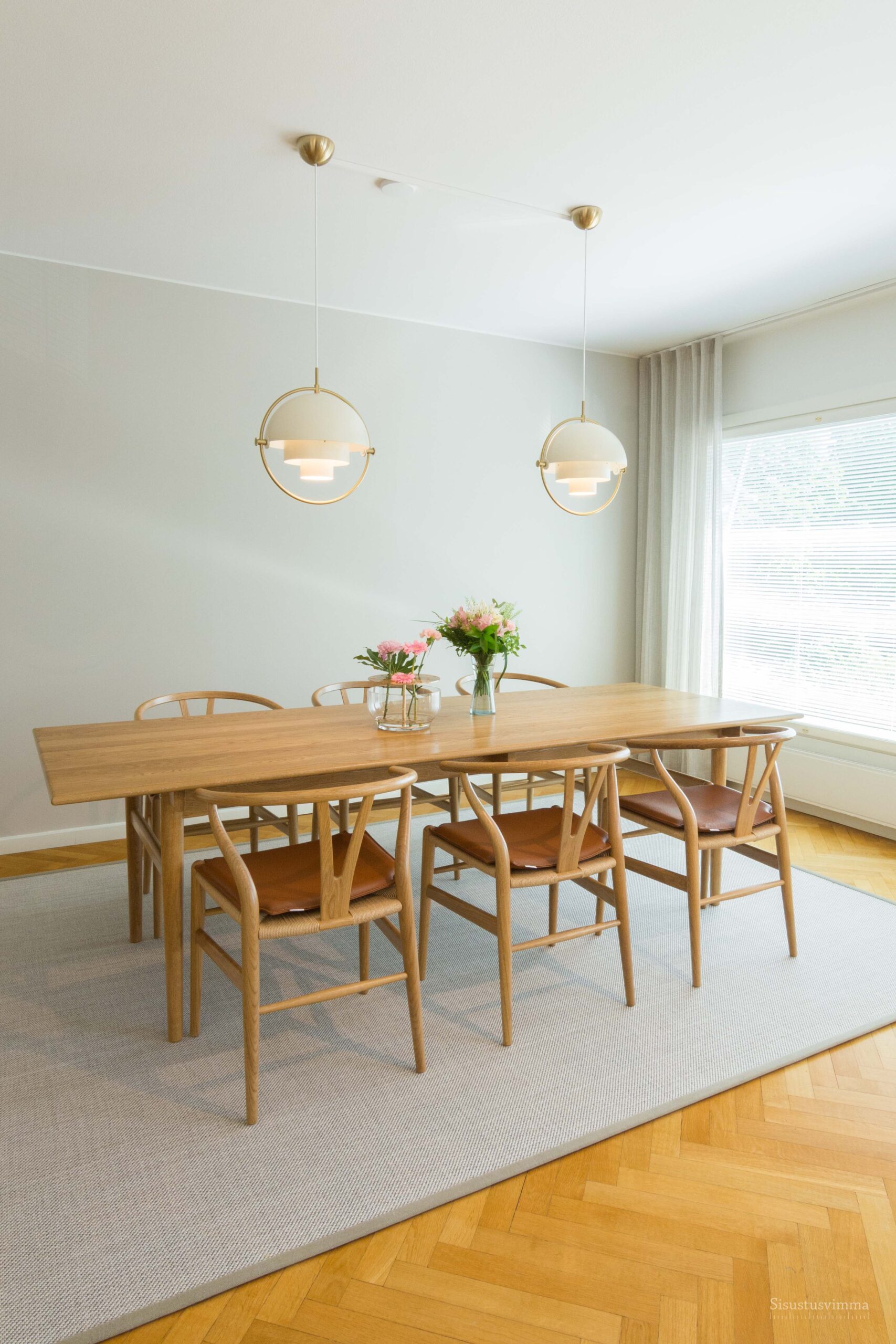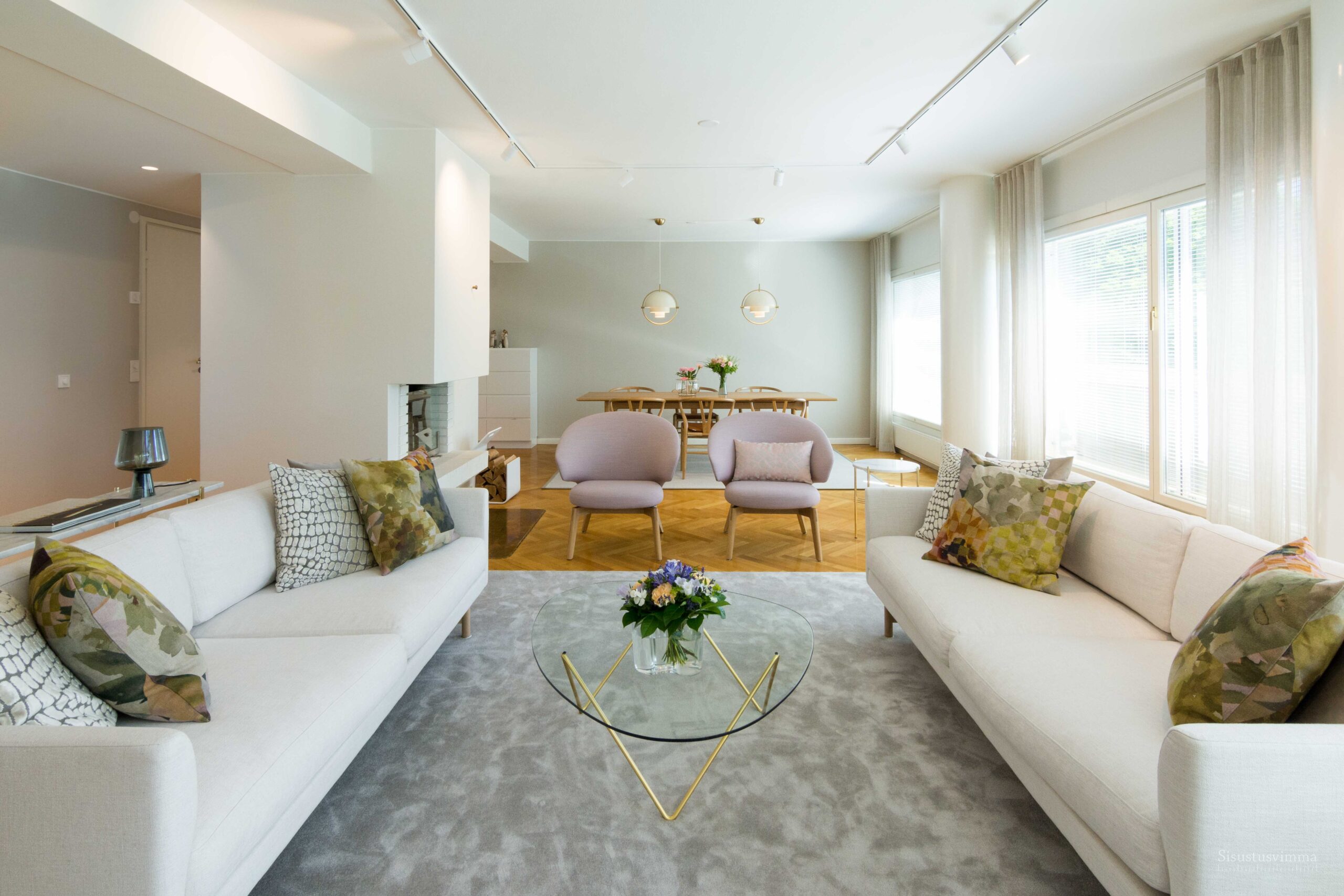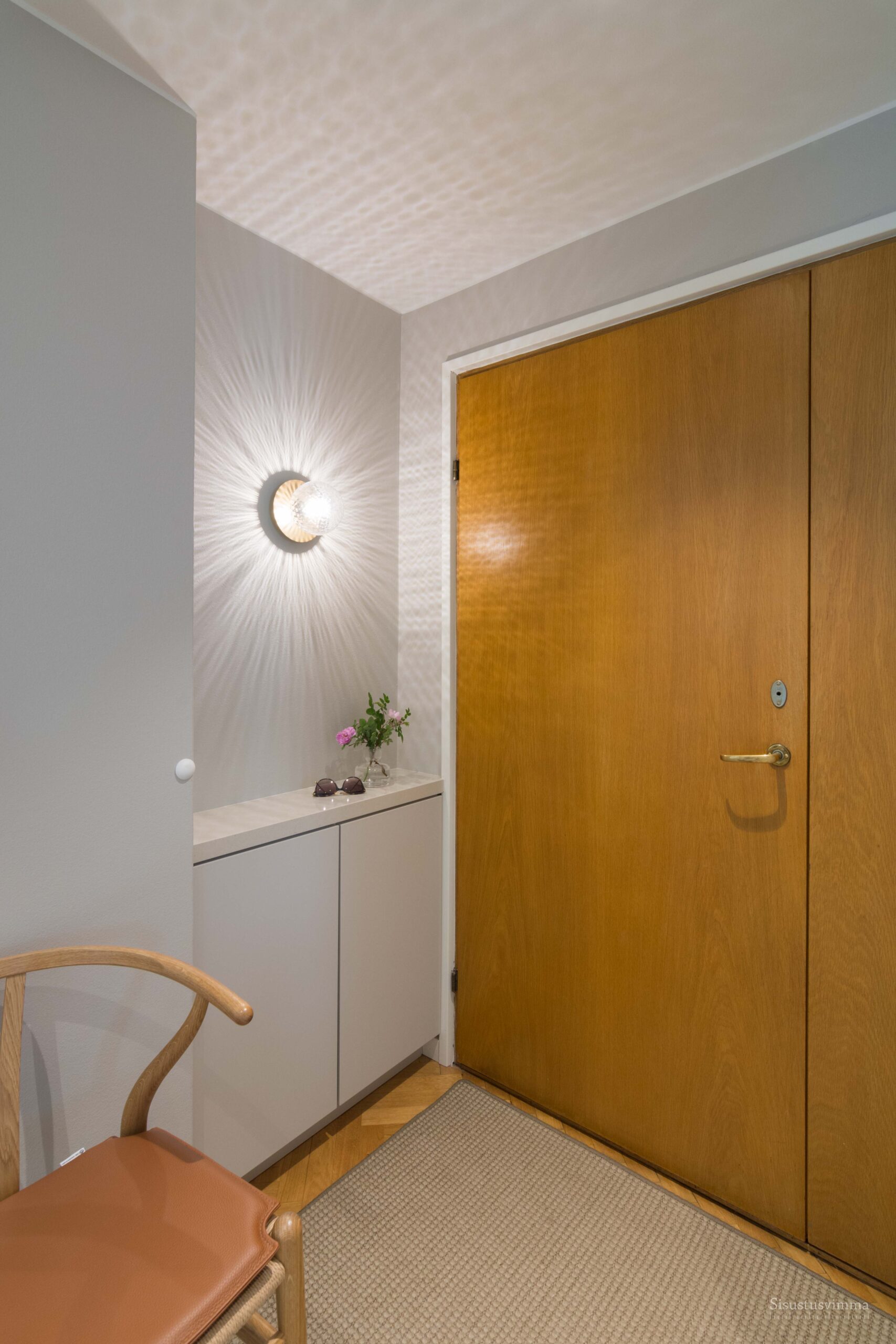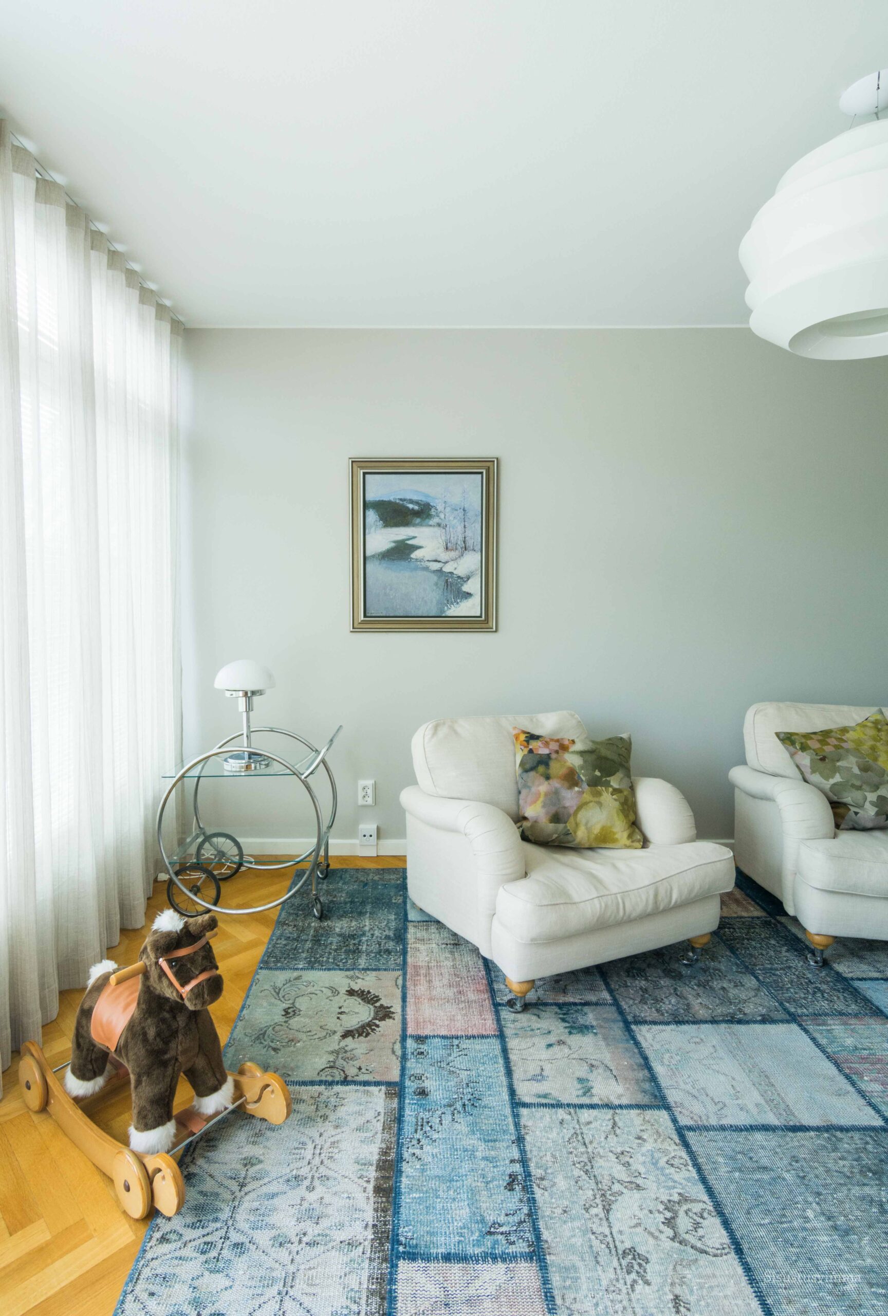 Tähän kerrostalohuoneistoon tehtiin täydellinen pintaremontti. Kaluste- ja valaisinhankinnoissa otettiin huomioon talon rakennusaikakausi. 60-luvun tyypillisiä pyöreitä muotoja yhdistettiin modernien ajattomien kalusteiden kanssa. Tapeteilla ja tekstiileillä saatiin aikaan kodikas tunnelma.
