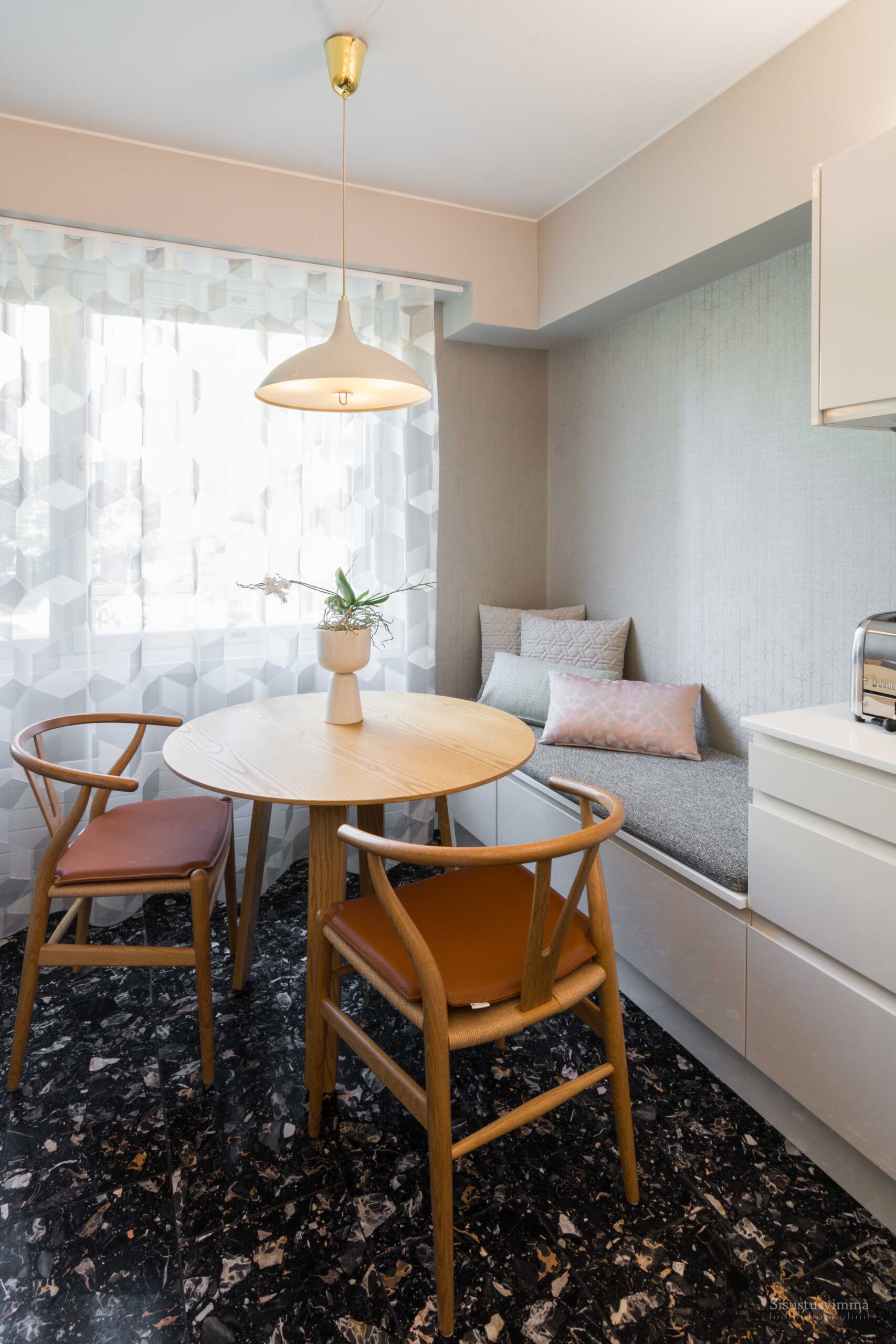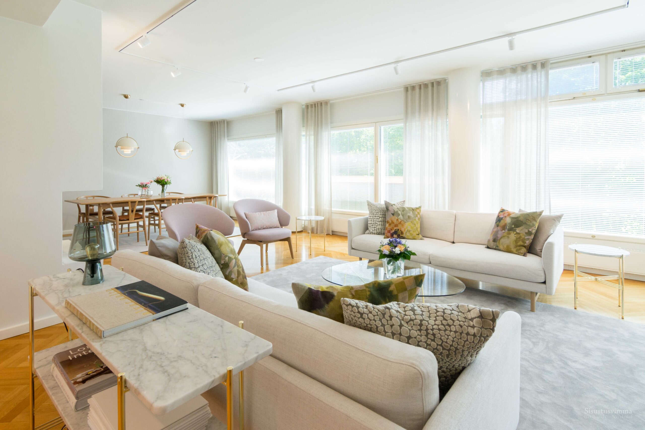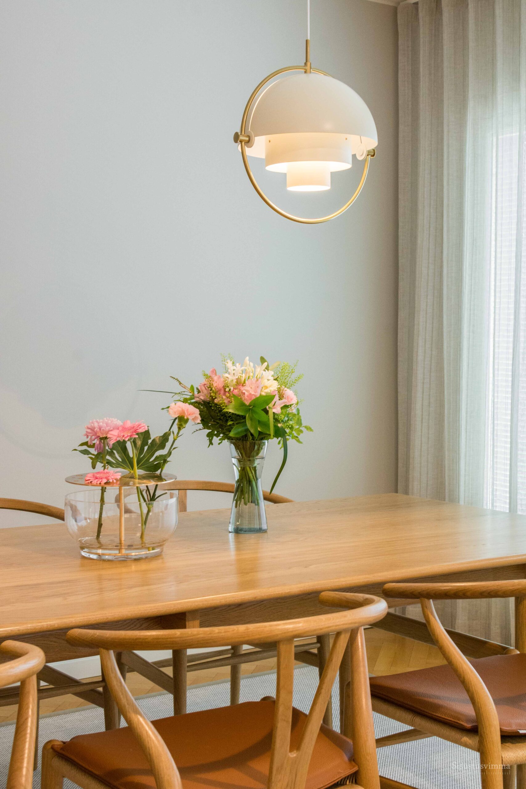 Tähän kerrostalohuoneistoon tehtiin täydellinen pintaremontti. Kaluste- ja valaisinhankinnoissa otettiin huomioon talon rakennusaikakausi. 60-luvun tyypillisiä pyöreitä muotoja yhdistettiin modernien ajattomien kalusteiden kanssa. Tapeteilla ja tekstiileillä saatiin aikaan kodikas tunnelma.