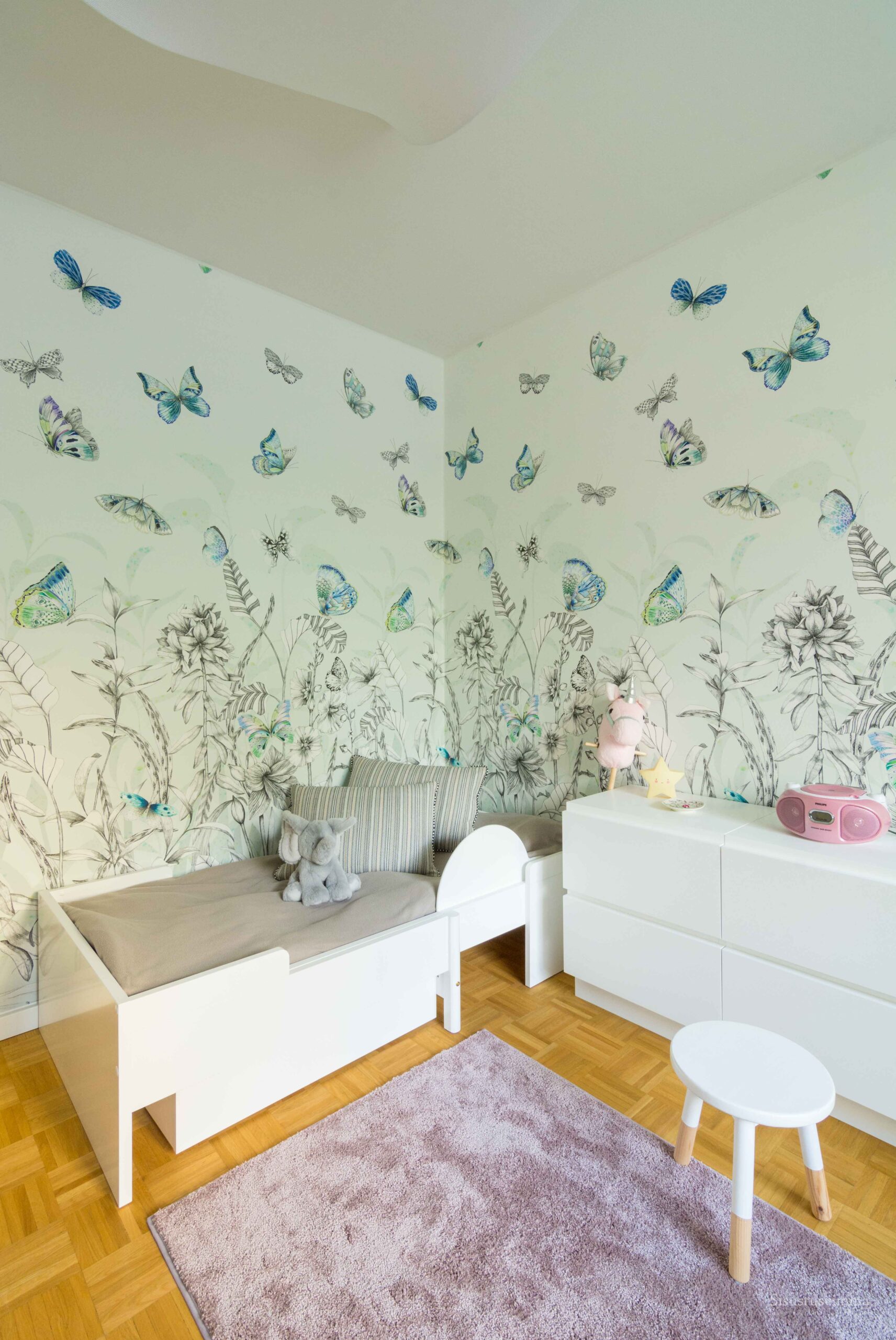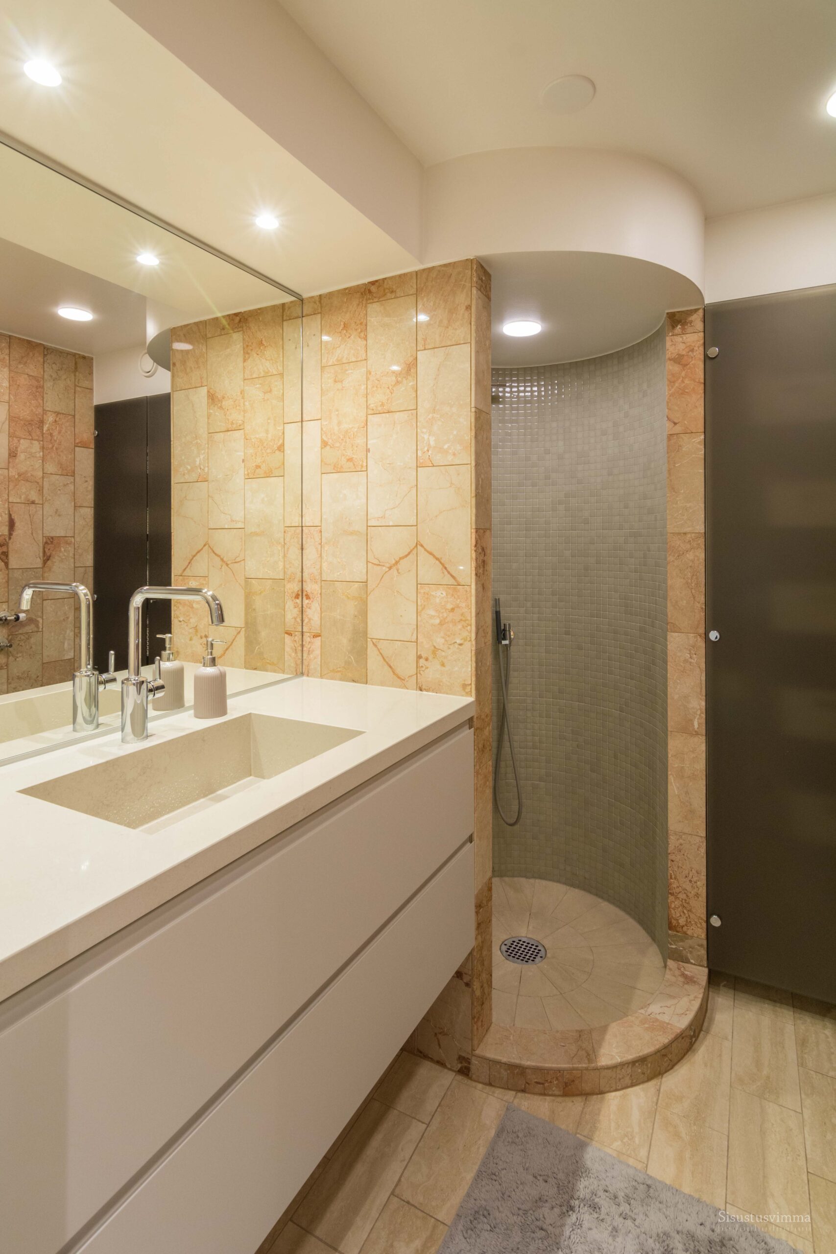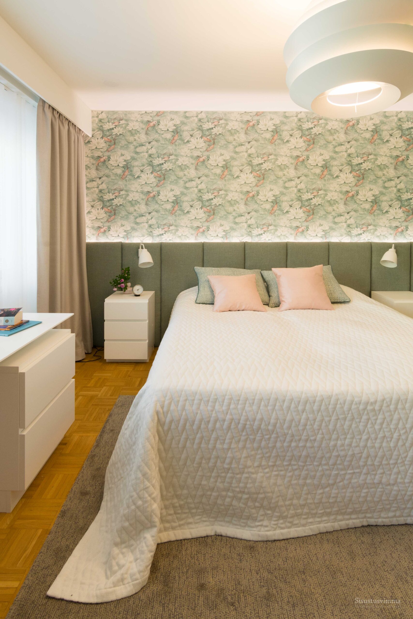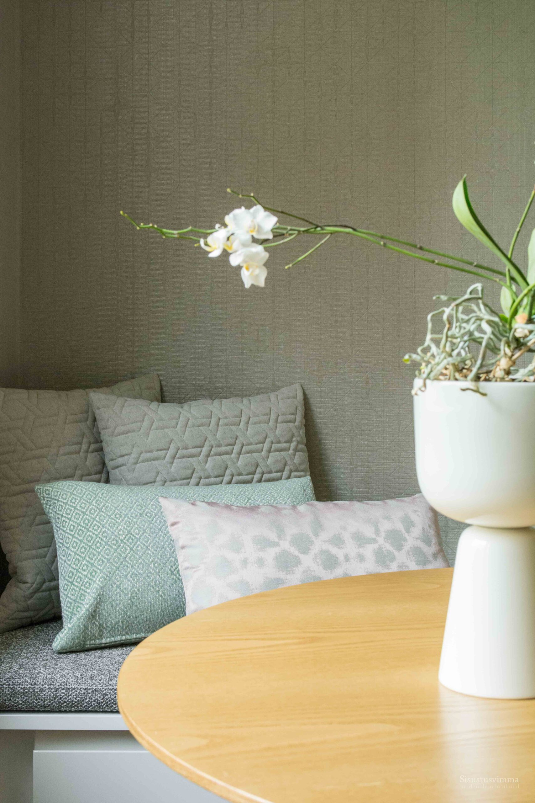 Tähän kerrostalohuoneistoon tehtiin täydellinen pintaremontti. Kaluste- ja valaisinhankinnoissa otettiin huomioon talon rakennusaikakausi. 60-luvun tyypillisiä pyöreitä muotoja yhdistettiin modernien ajattomien kalusteiden kanssa. Tapeteilla ja tekstiileillä saatiin aikaan kodikas tunnelma.