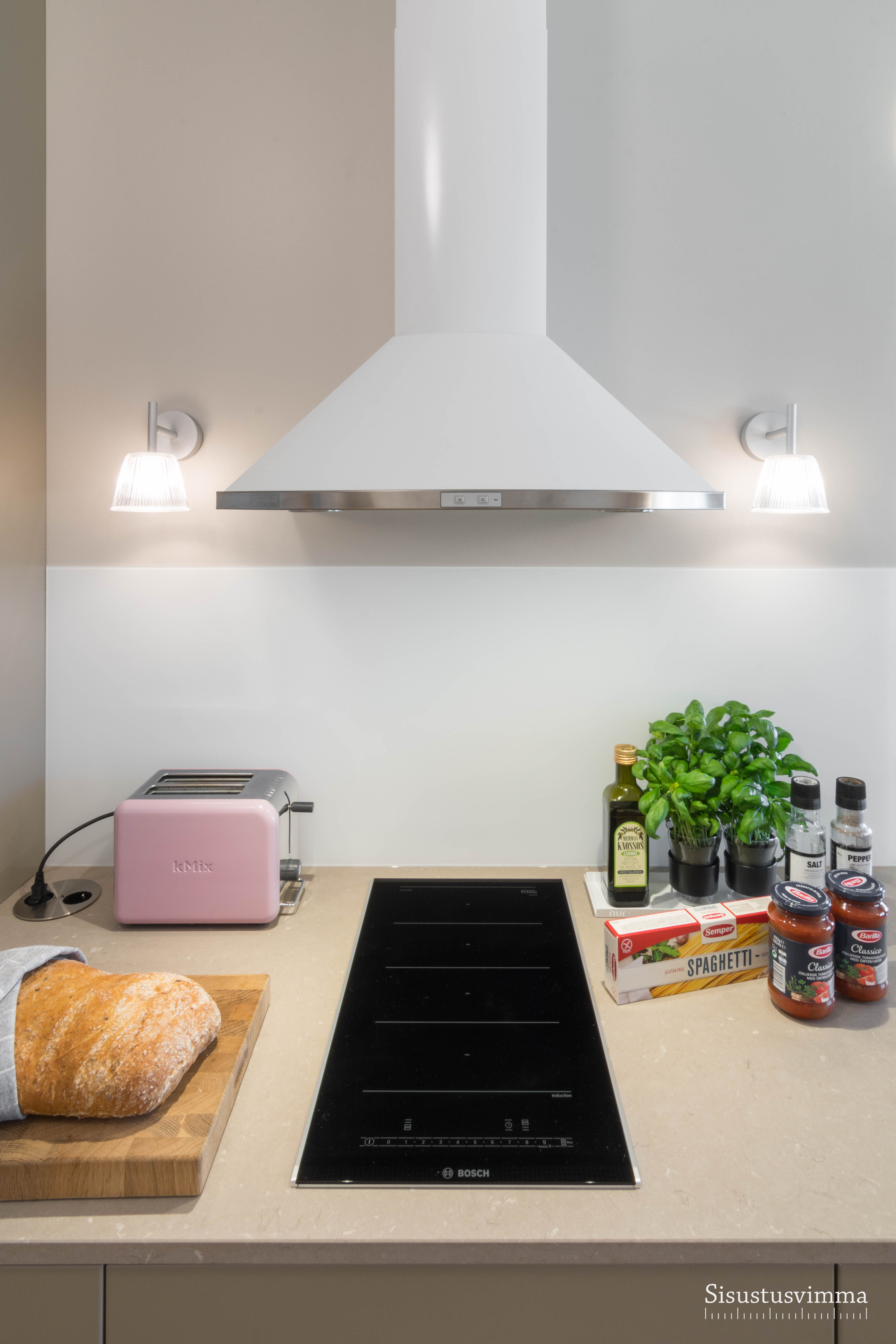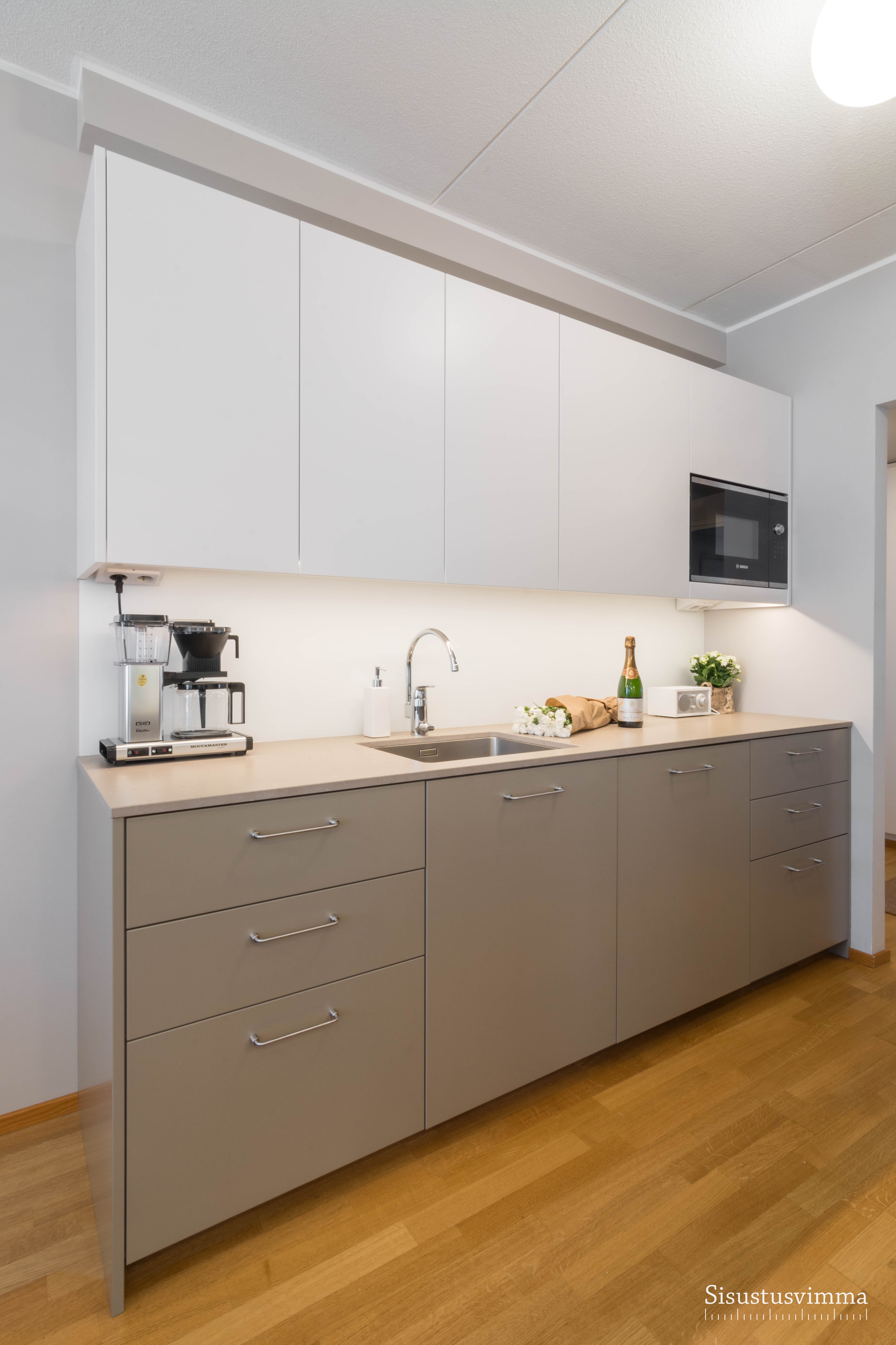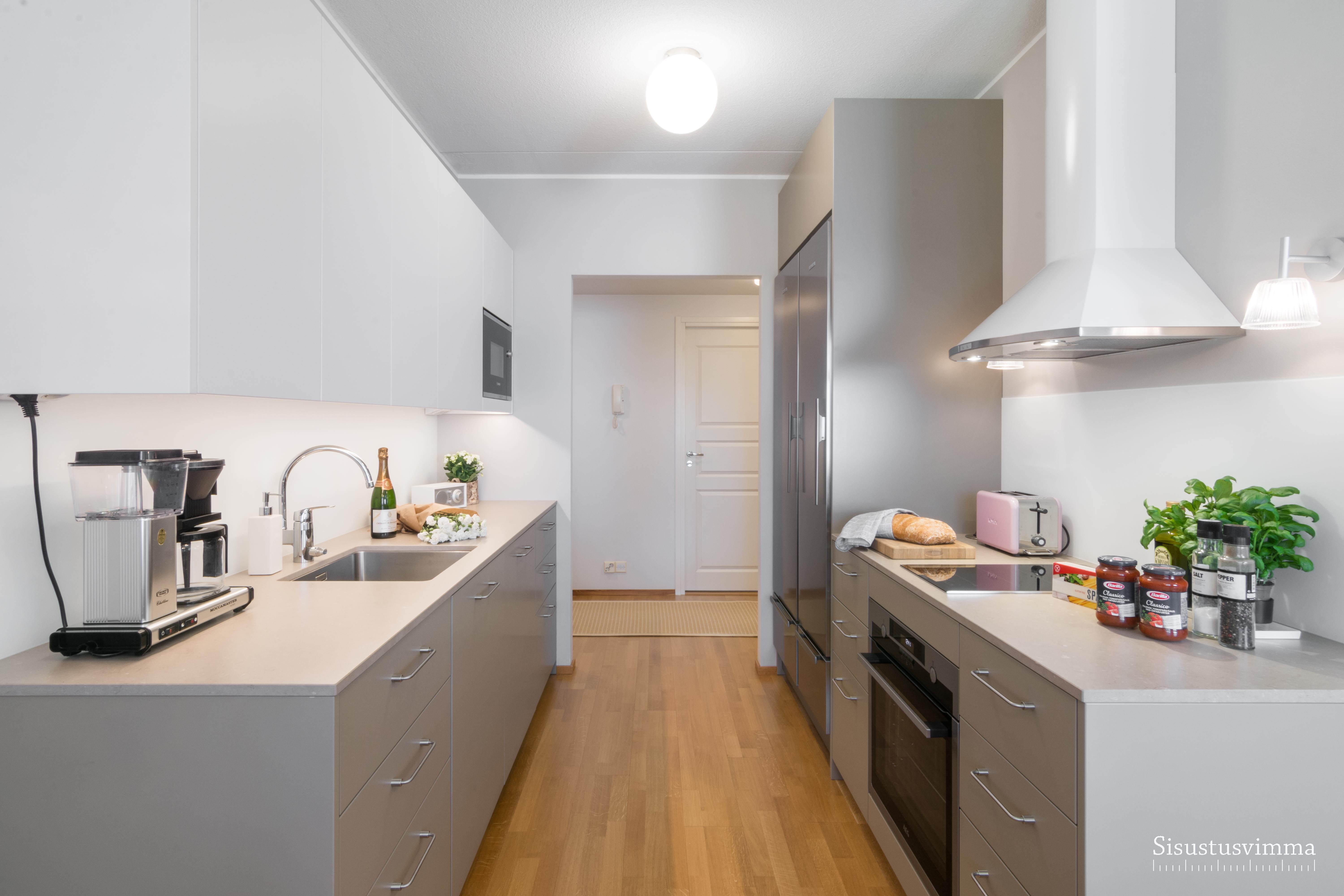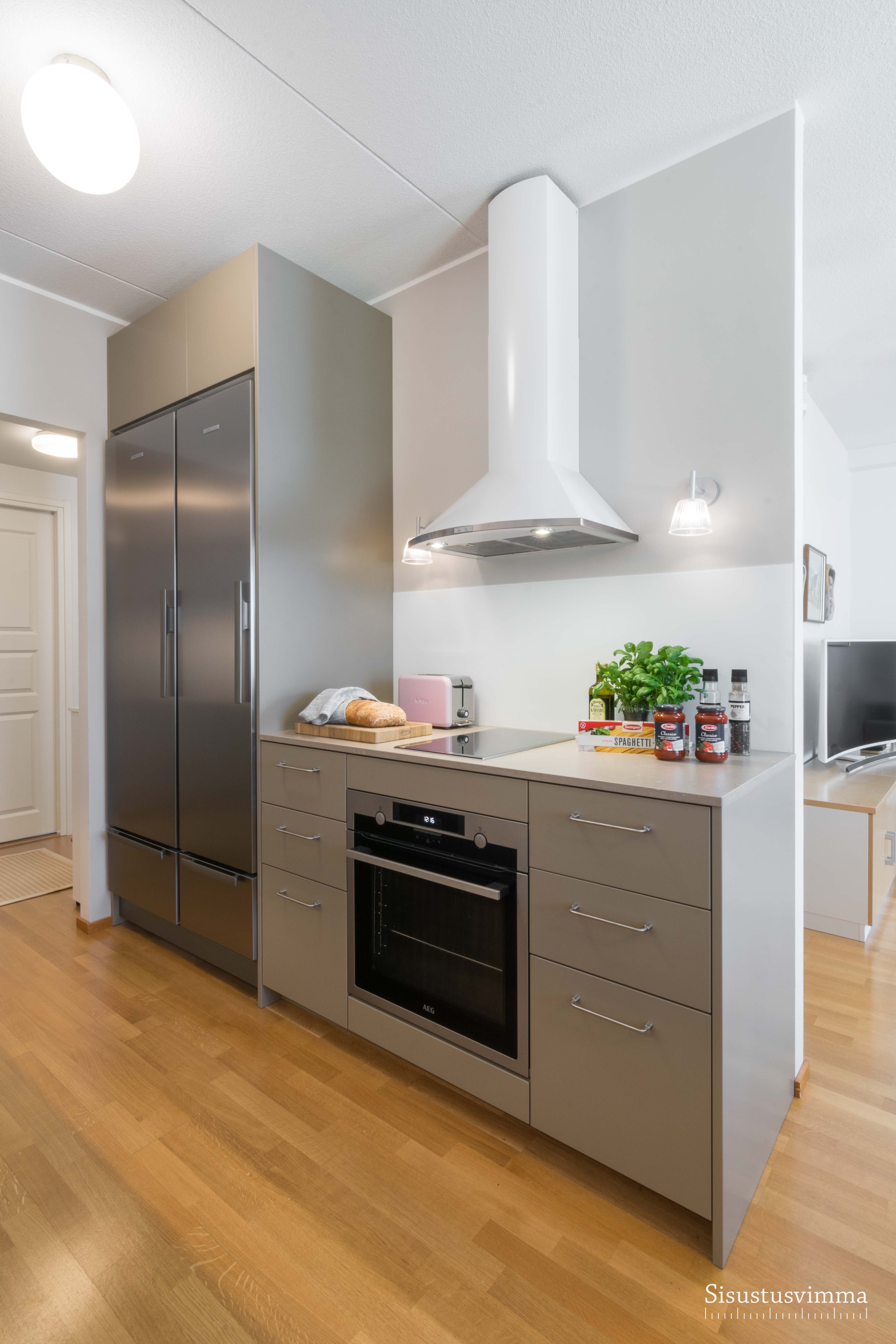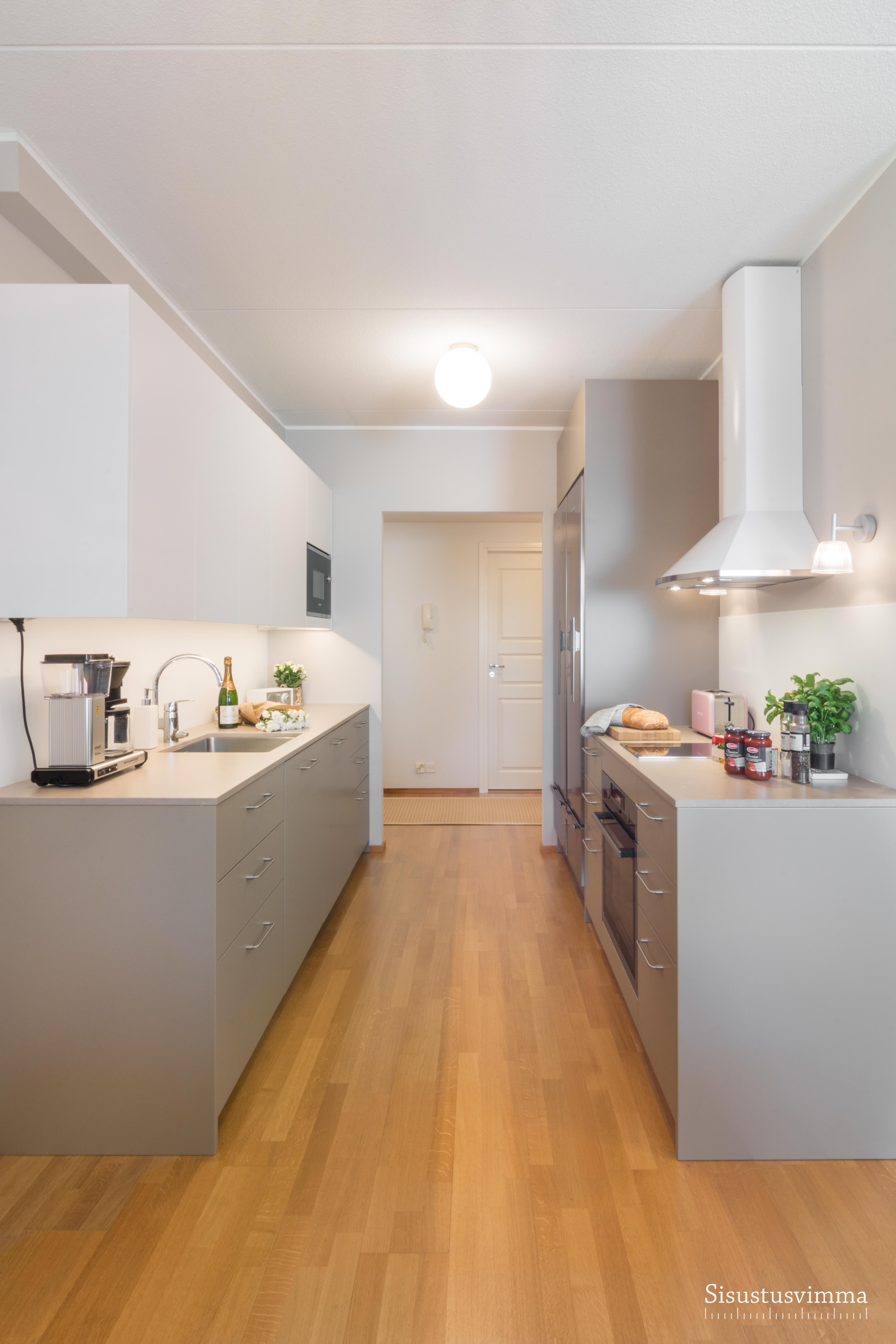 Keittiön suunnittelu aloitettiin kylmälaitteiden miettimisellä. Myös kvartsitasot olivat toivelistalla. Laskutilaa saatiin enemmän valitsemalla kapea induktioliesi. Liesiseinälle ei laitettu yläkaappeja jotta käytävämäinen keittiö ei tunnu niin ahtaalta ja se avautuu paremmin olohuoneeseen päin. Neutraalit sävyt on lämpimät ja ajattomat.